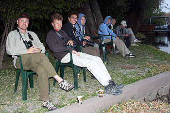 The absolutely gorgeous !Xaro Lodge had everything: sundowners by the open fire at the water’s edge, gorgeous, comfortable tented rooms with incredible views, a knowledgeable and friendly host, excellent food (including a birthday cake for Duncan), great birding in the grounds and even our own Hippos in the grounds at night.