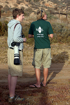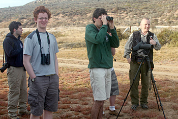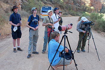 26th MarchUp and out into the field (actually, along the roadside) in search of larks. Sadly, we didn’t see any, but there was quite a bit of song to listen to in the distance… But we did score with Chestnut-vented Tit-babbler, White-throated Canary, Fairy Flycatcher, Long-billed Crombec and a few other assorted bits and pieces! Soon it was time to take our boat trip out into Lambert’s Bay, and an hour’s gentle chug round the still waters produced the required result – half a dozen excellent Haviside’s Dolphins, including a young calf. Nice! After that, the two halves of the group swapped, and while Group B went to see the dolphins, Group A took in the enormous Cape Gannet colony, along with White-fronted Plover, and a good selection of gulls, terns and cormorants. Pre-lunch, we took a trip to the local salt pans down by the railway – lots of good wading bird list-padders railway, summer-plumage Curlew Sandpipers, Capped Wheatear, Three-banded and Kittlitz’s Plovers and so on. We had lunch back at the sea front, and for the afternoon session took a trip up to Krantzvleipoort Valley, about an hour inland. The dusty hills here produced a few nice species – Layard’s Tit-babbler, Mountain Wheatear and most sought-after of them all, Protea Canary. Rainer had a special treat for us for dinner tonight – a seafood BBQ at Muisbosskerm, a famous beach restaurant just south of Lambert’s Bay. Delicious and extremely atmospheric – plus local Afrikaans folk music....more enjoyed by all was James’ guided tour of the southern hemisphere night sky, including Saturn, the Magellanic Clouds and the Coal Sack. Look ‘em up! 27th MarchIt was an early but sadly foggy start – so we abandoned our attempt to see larks along the coast road! We drove straight south towards West Coast NP – but made a couple of emergency stops, for Black Harrier (Simon’s top target species), Lanner Falcon, and what turned out to be a good lark field – Karoo, Red-capped, Cape Long-billed and Large-billed. But the top bird of the journey for most was a Southern Black Korhaan (female) at the service station! We arrived at Langebaan mid-morning – it’s a sadly overdeveloped seaside resort. Into the National Park – too many snakeskins for comfort, two more Black Harriers and brief views of Grey-winged Francolin in flight. We took lunch at a really nice old Dutch colonial house by the lagoon – a stunning Cape Longspur, African Hoopoe, Spotted Flycatcher, Cape Weaver etc. Most of us (lightweights excluded) took a walk out to a hide at the end of a boardwalk – while we only heard African Rail, we saw Levaillant’s Cisticola, African Fish Eagle, and lots of waders (Curlew Sandpiper, Little Stint, Whimbrel and just a single Chestnut-banded Plover). Post lunch, a couple of short walks in the strandveld produced more of the same plus Cape Penduline-tit – and better views of Grey-winged Francolin (8) plus Bar-breasted Apalis and a superb male Korhaan in flight. We made a final stop at a second hide by the lagoon – more great waders, including five Terek Sandpipers, several summer plumage Knot, Bar-tailed Godwit and more besides, including Little Tern. Finally, we drove to a Windstone backpacker hostel for an overnight – and a meal at a pretty ghastly Wild West themed restaurant in town....we got home late and very tired. Double log tonight....and rather brief diary style.... 28th MarchUp at 0515, a quick breakfast in the communal dining room, and away into the fog – and it was pretty thick! Almost everyone slept most of the way to Cape Town, and so few of us got to say goodbye to the city, except for the airport! We checked in for our Mango Airways 0940 flight, and relaxed… Flight on time, and an easy two hours to Johannesburg. We partook of a delicious lunch at a local restaurant serving traditional South African fayre – it was called (interestingly) “Subway”. And then onto the road for the long (very long!) drive east to Kruger. Our bus was excellent, as was our driver, John, and we cracked on for just over five hours (!) – highlights en route included Long-crested Eagle, Palm Swift, and Calum playing Pokemon in his sleep. We missed the 1800 curfew for the park gate, but not to worry – Rainer rustled up an escort to get us to Skukuza by about 1930, and we settled in to our very roomy, AC cabins. Happy days indeed! |